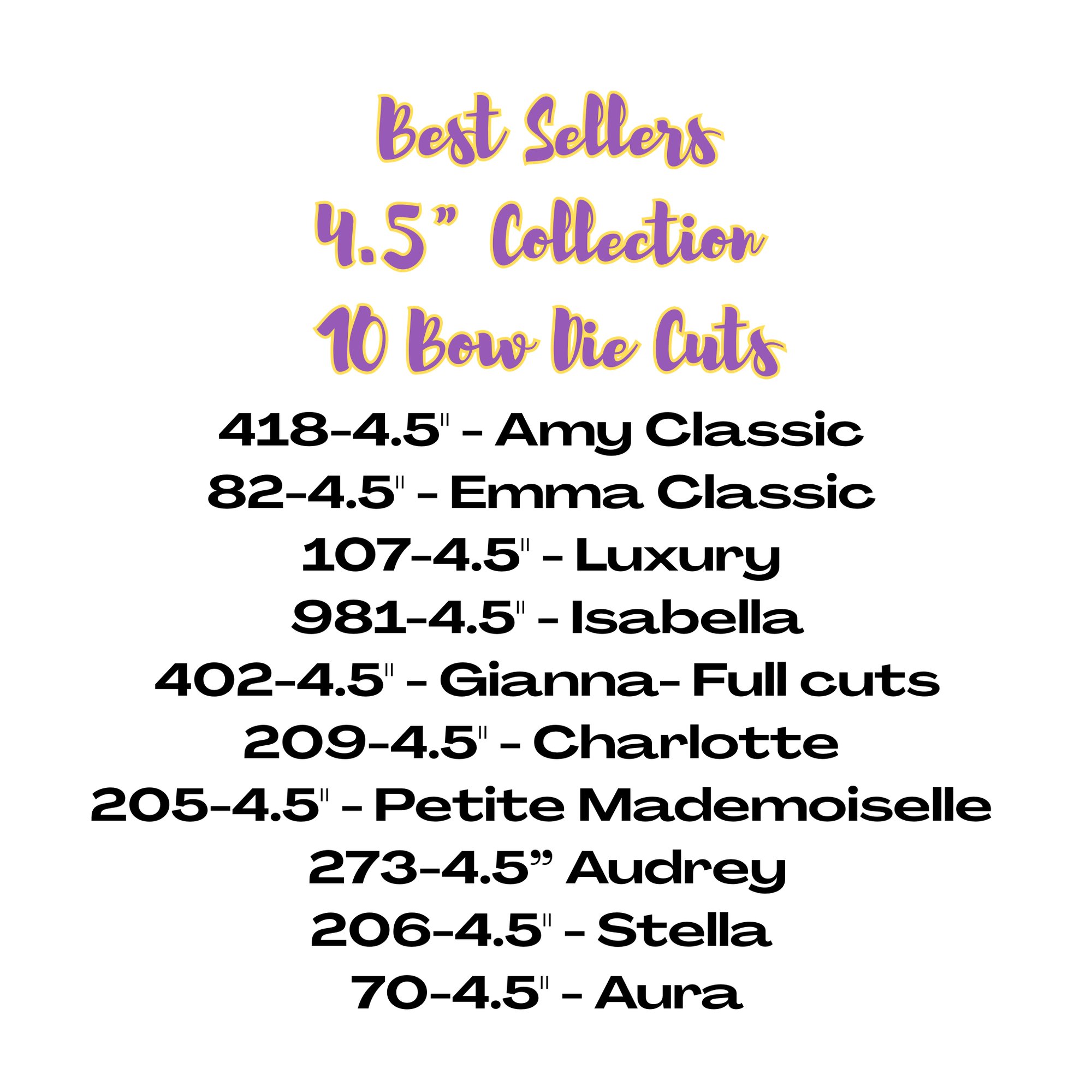 In this set you'll receive 10 dies to make 4.5" bows for the following: